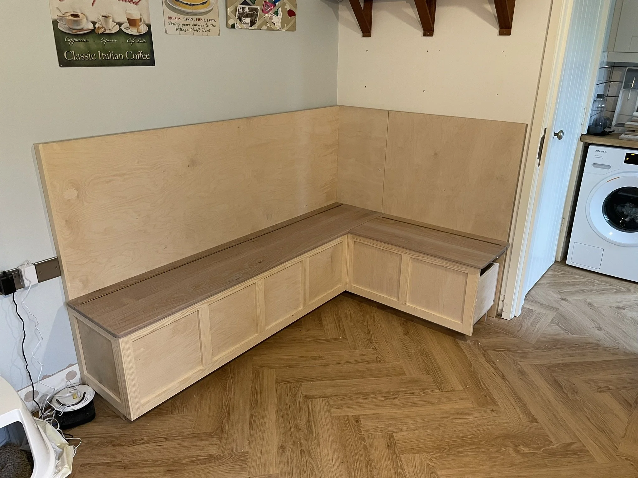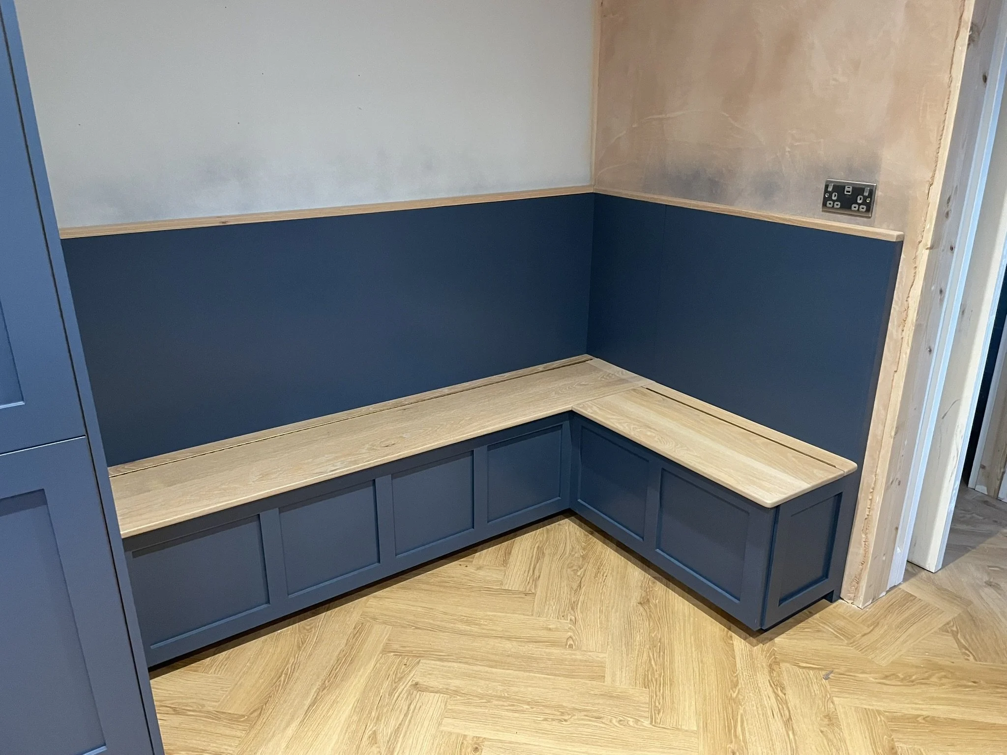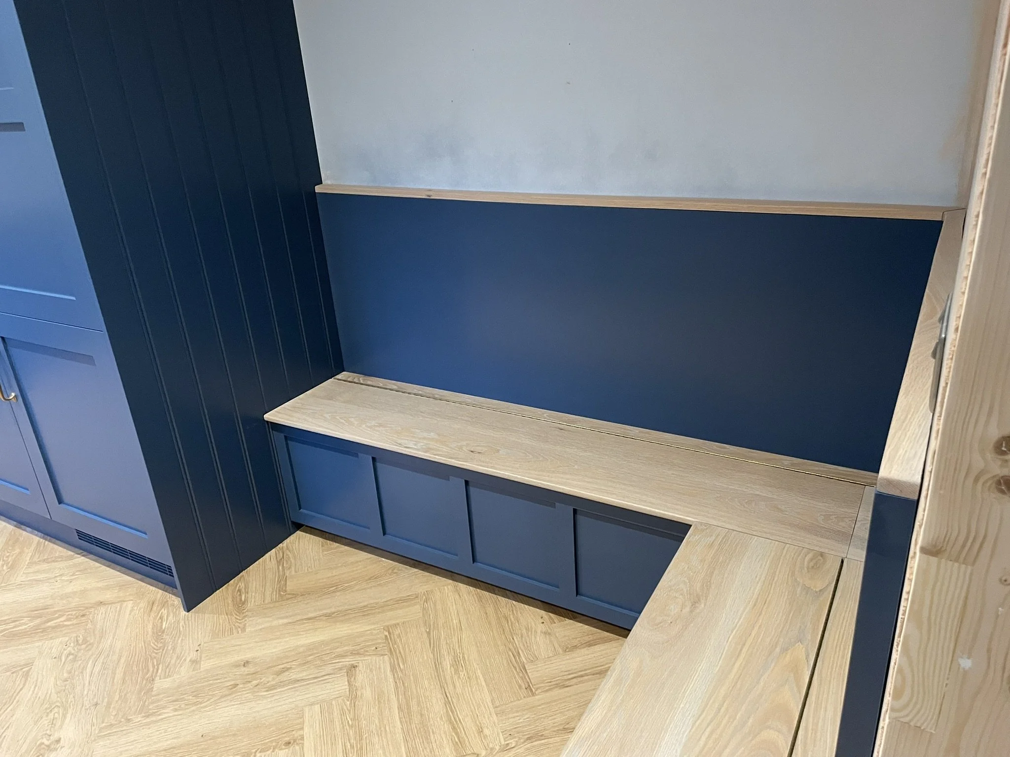 To solve this, we replaced it with a banquette bench. The bench features lift-up seating for hidden storage, along with a 750mm fully extending drawer. Constructed from birch plywood and complemented with painted finishes, white oak benchtops, and trim, it provides seating, storage, and a place to eat, craft, or do homework.