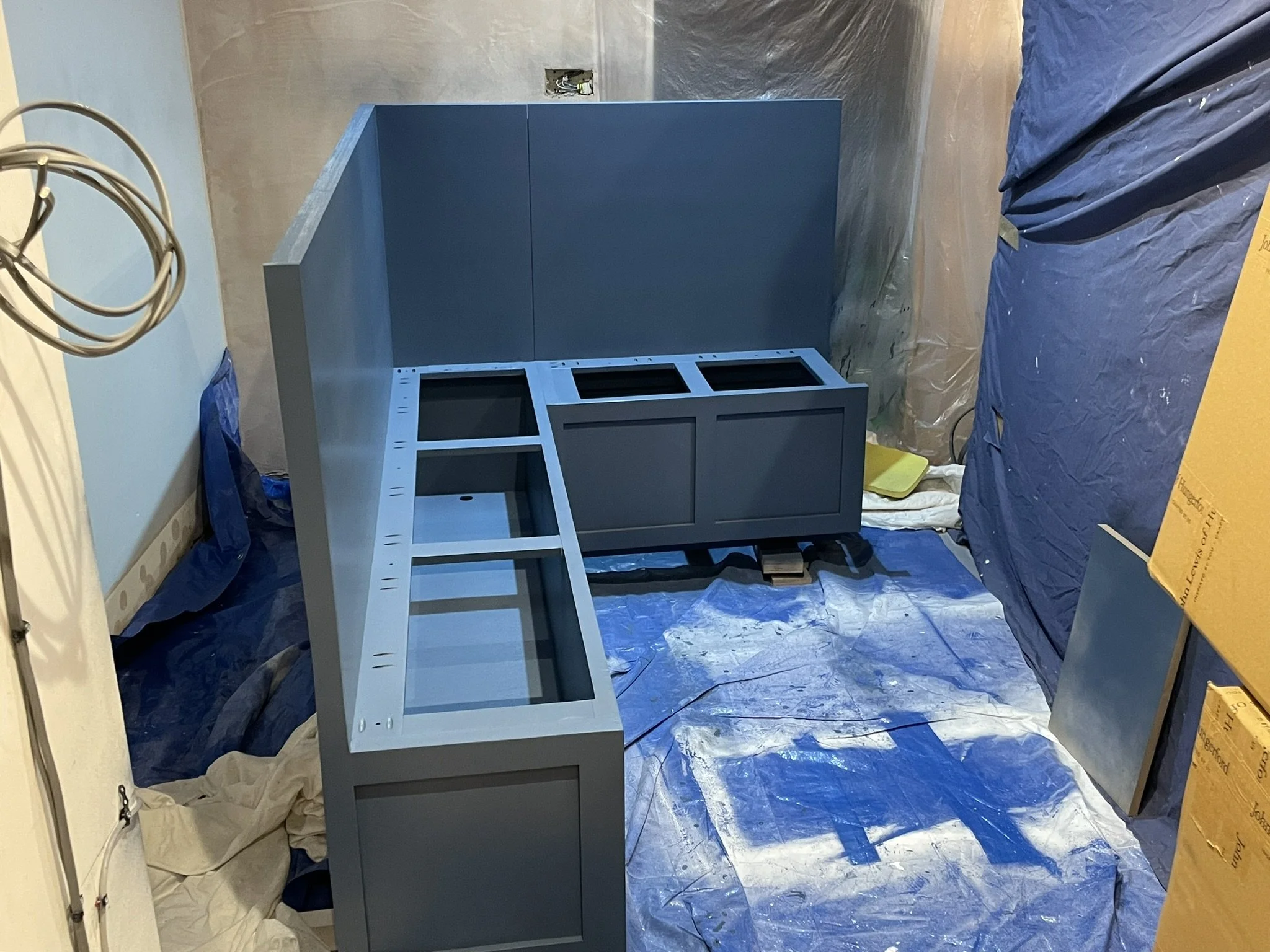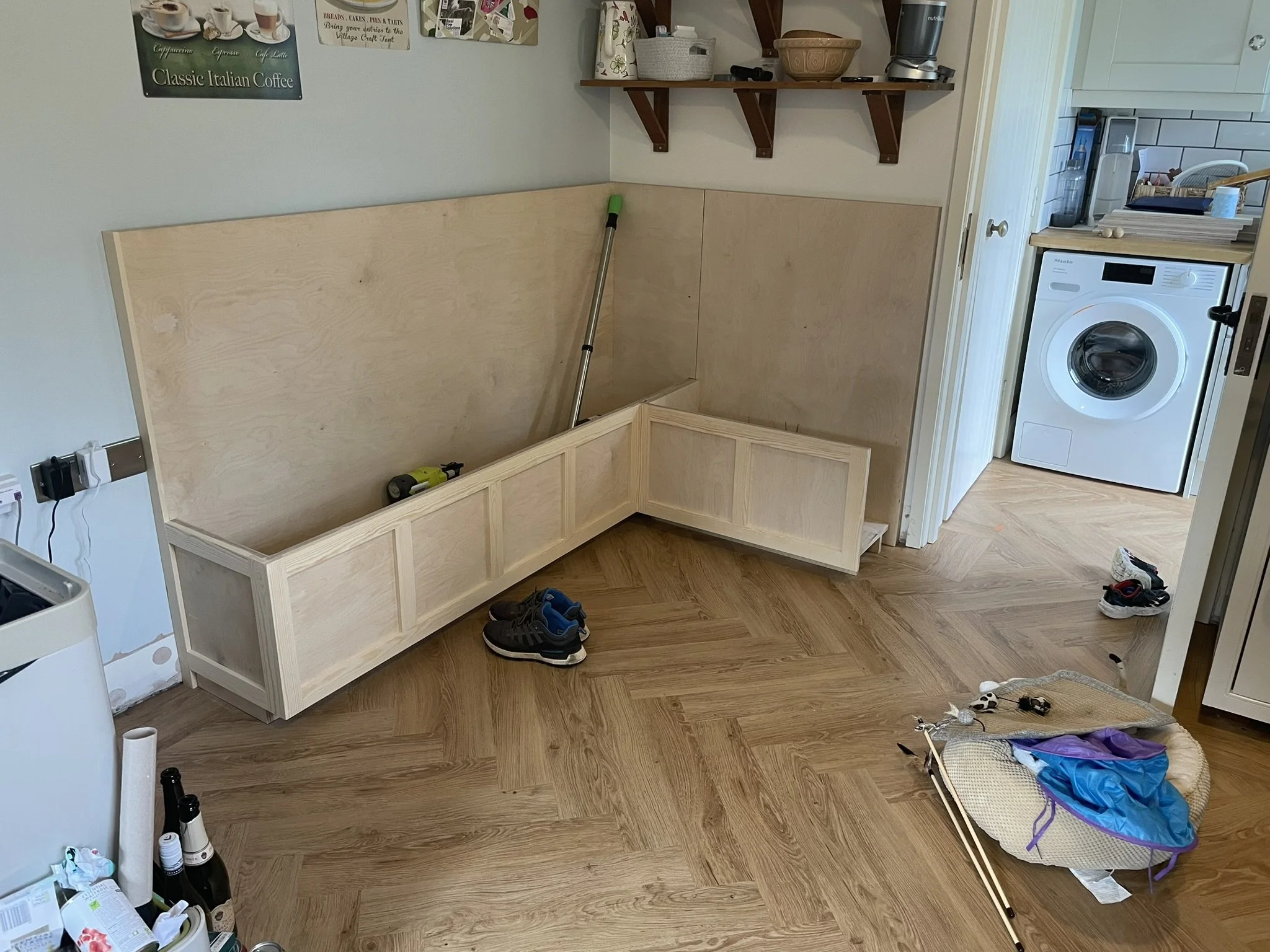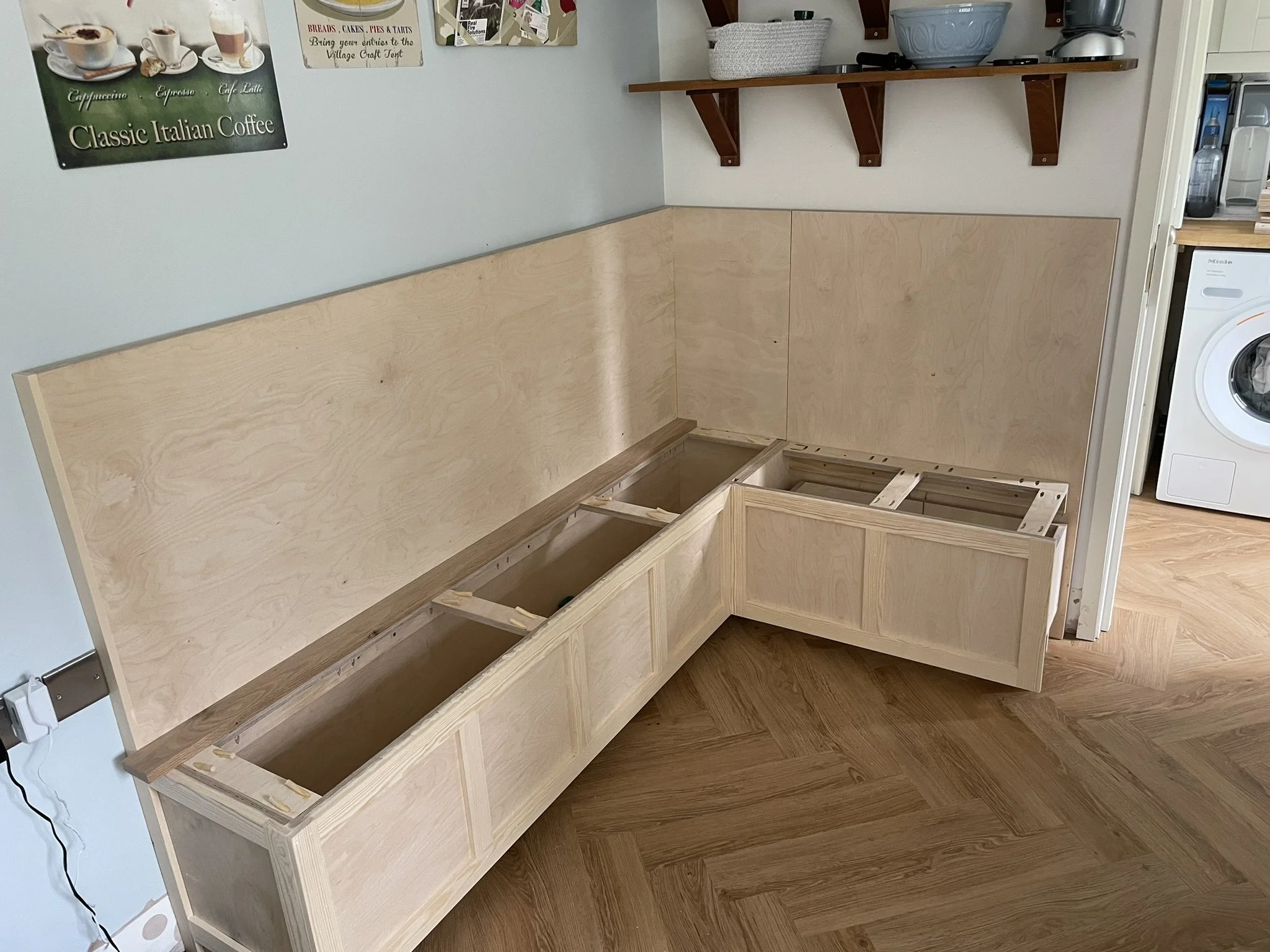 To solve this, we replaced it with a banquette bench. The bench features lift-up seating for hidden storage, along with a 750mm fully extending drawer. Constructed from birch plywood and complemented with painted finishes, white oak benchtops, and trim, it provides seating, storage, and a place to eat, craft, or do homework.