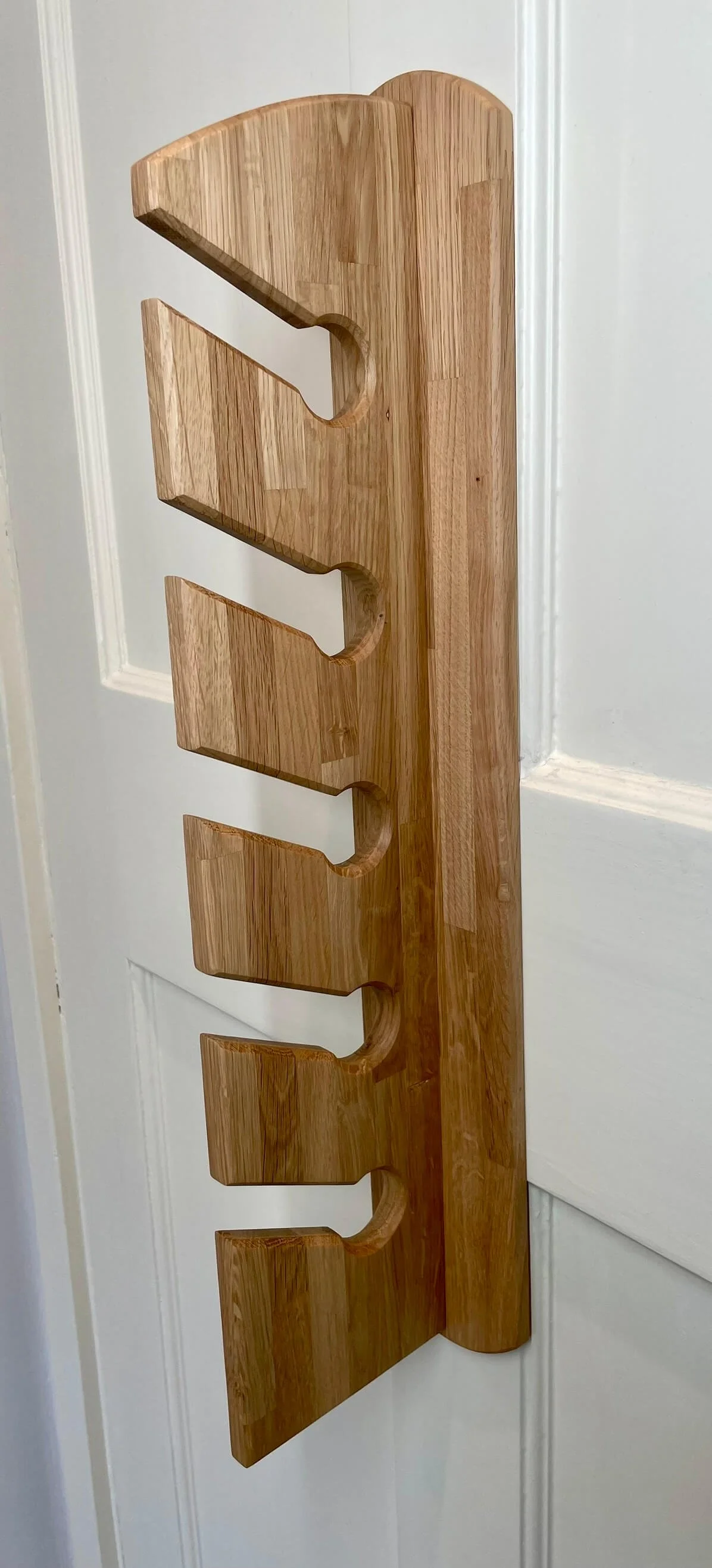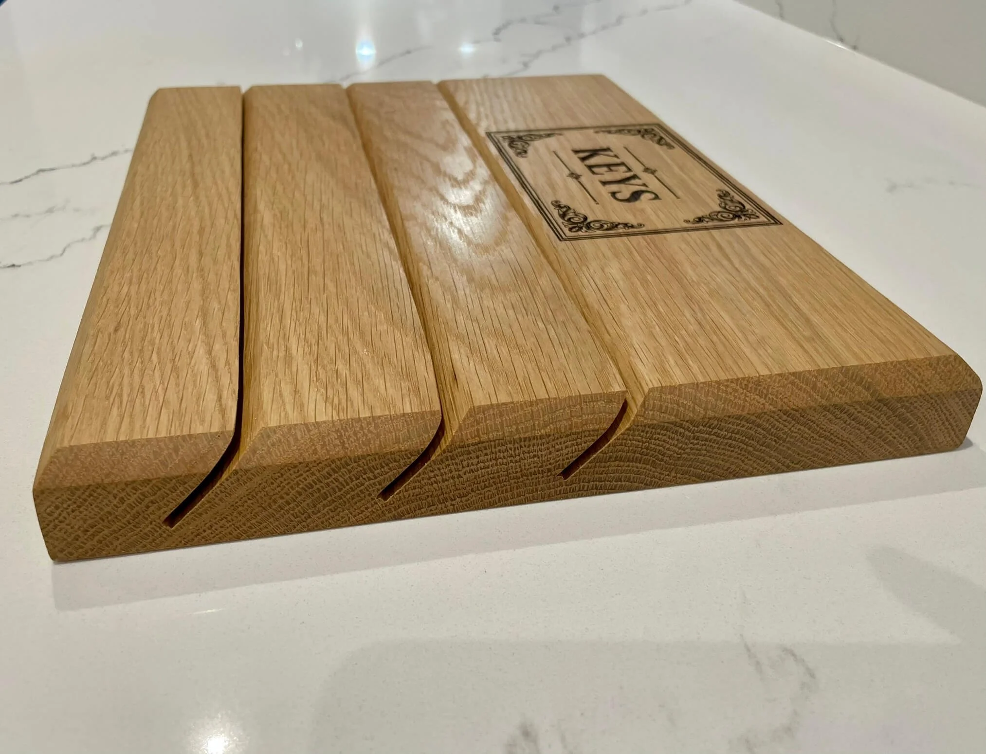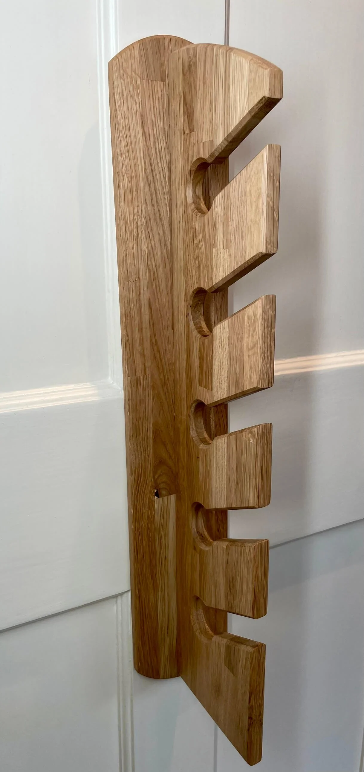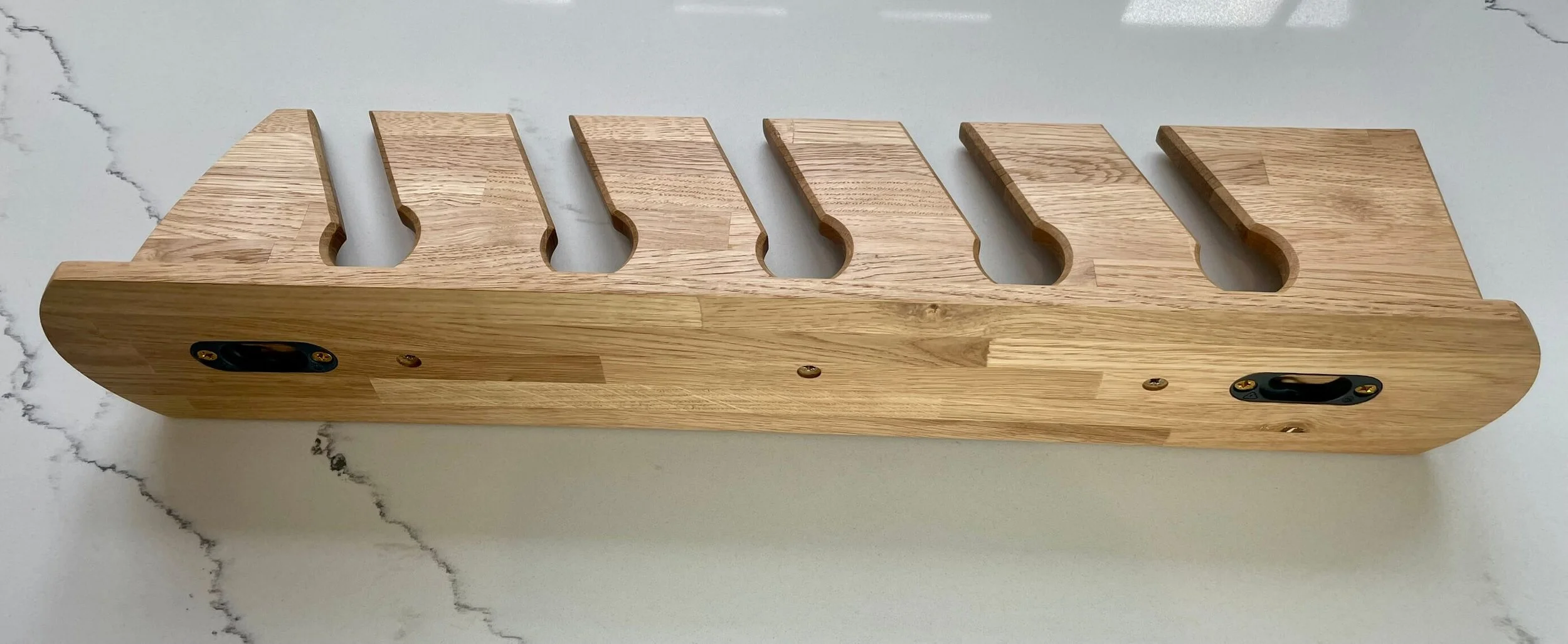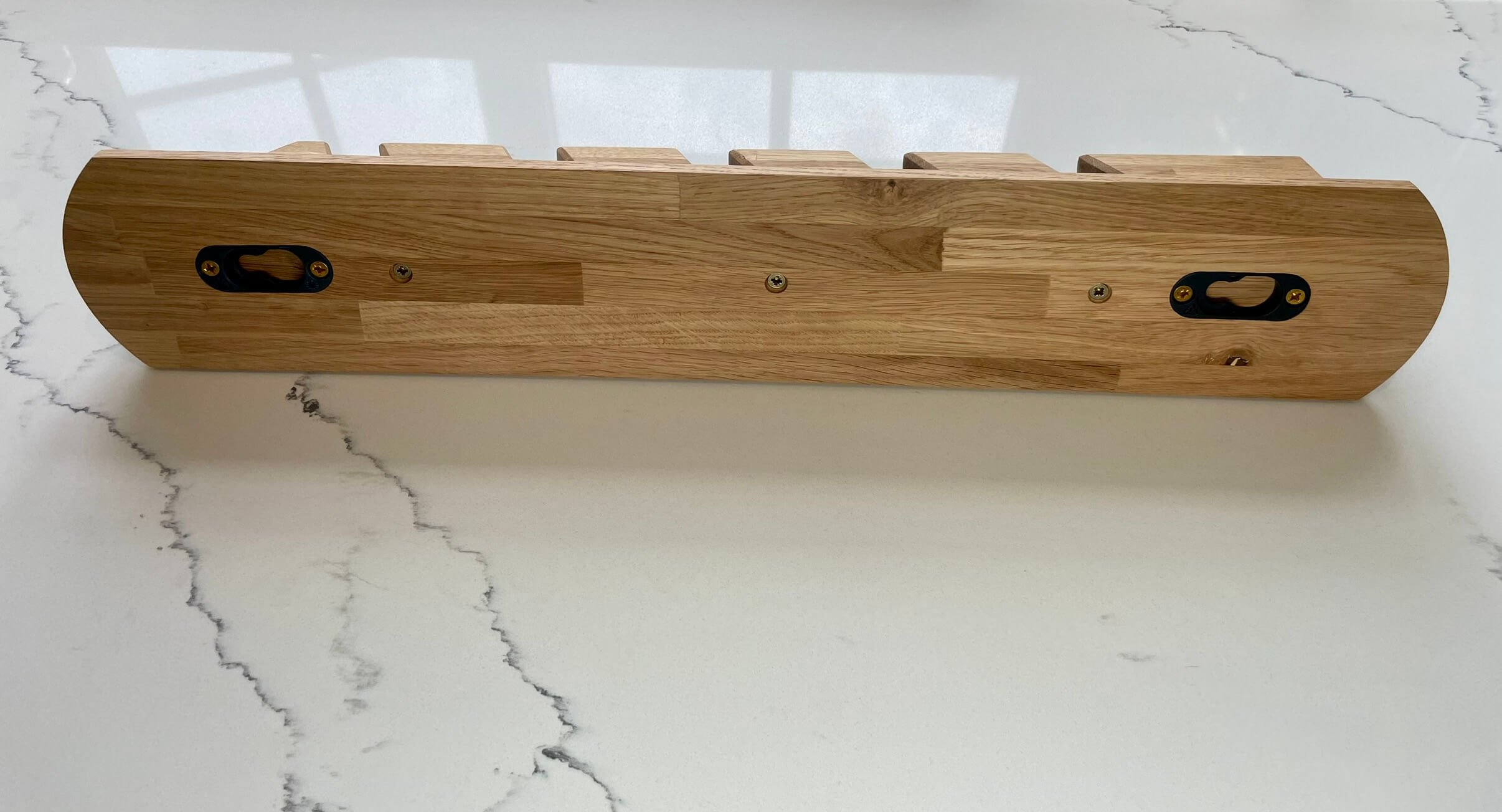 • This Key Hub is made from solid white oak and has angled slots where keys slide in and stay by gravity. It’s finished with a durable hard wax oil. To install, simply attach two mounts to the wall (supplied), then click the Key Hub onto them securely.