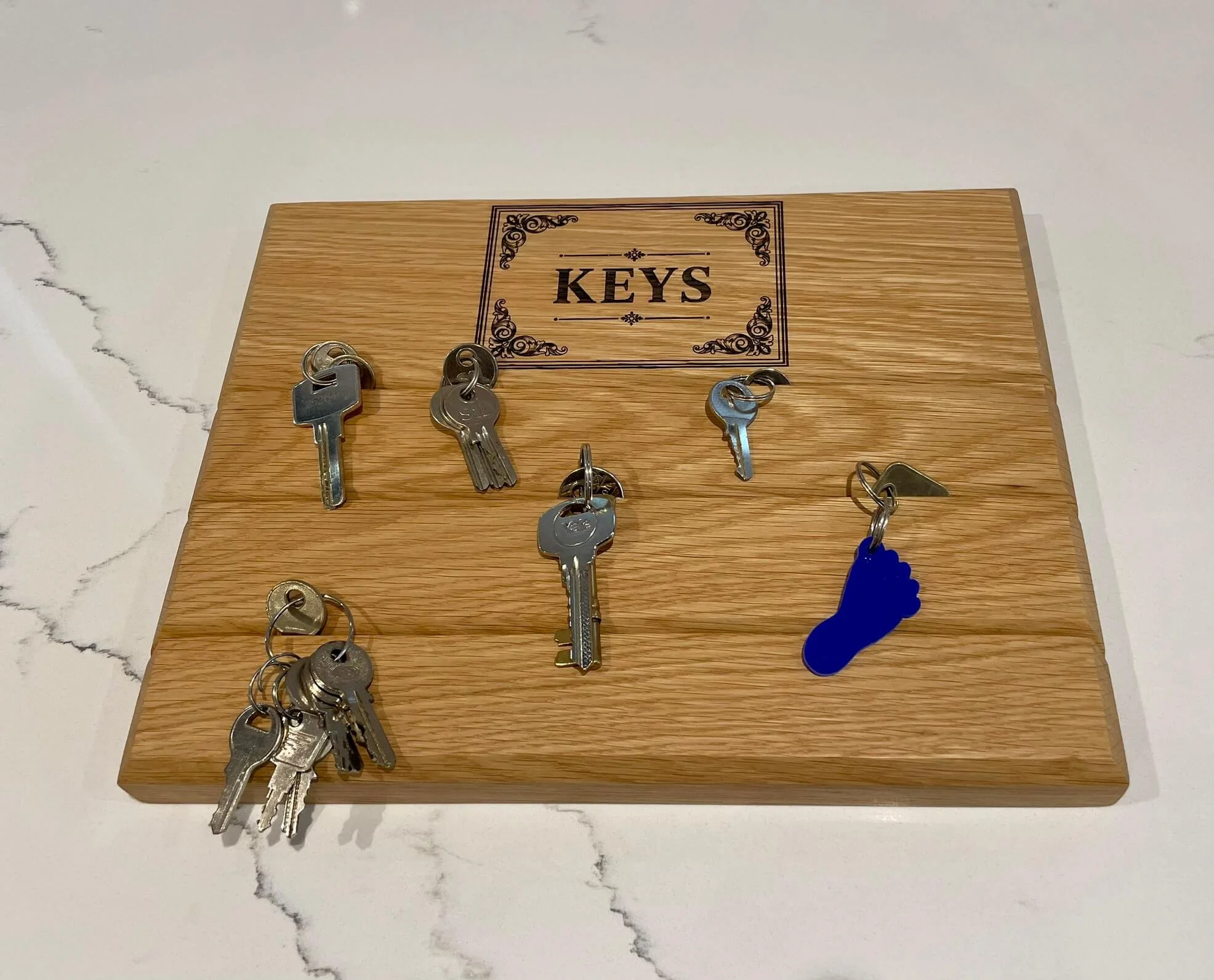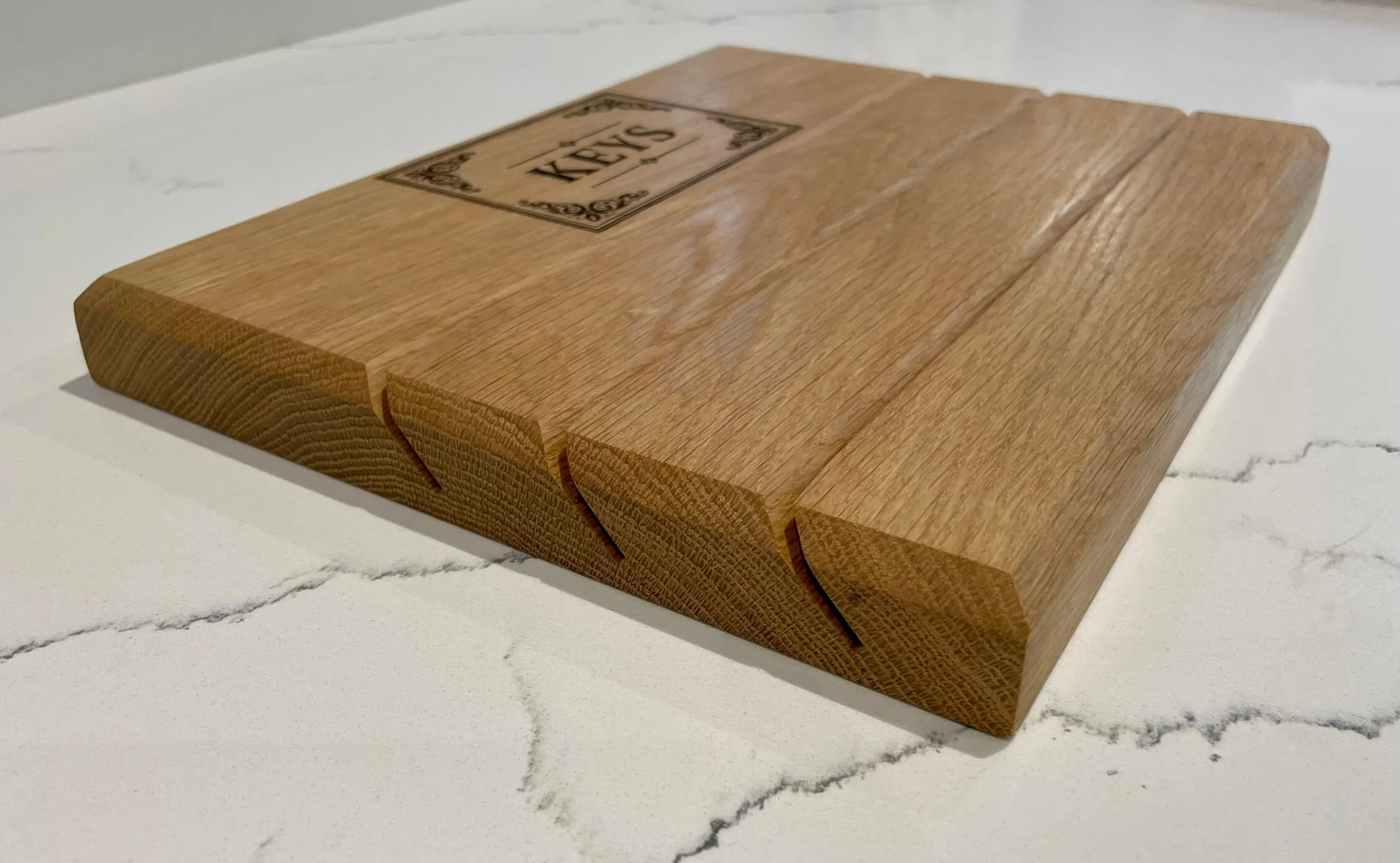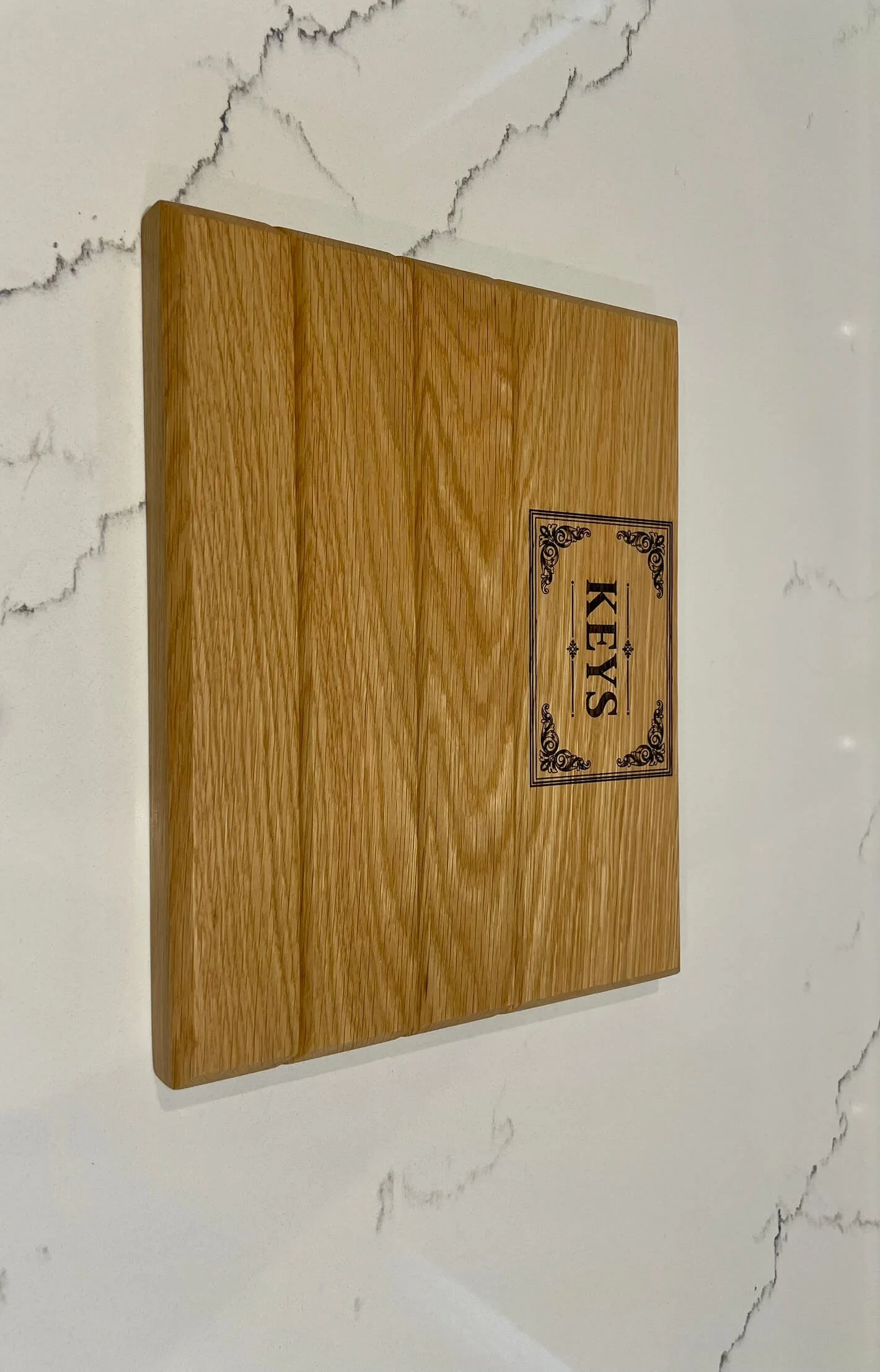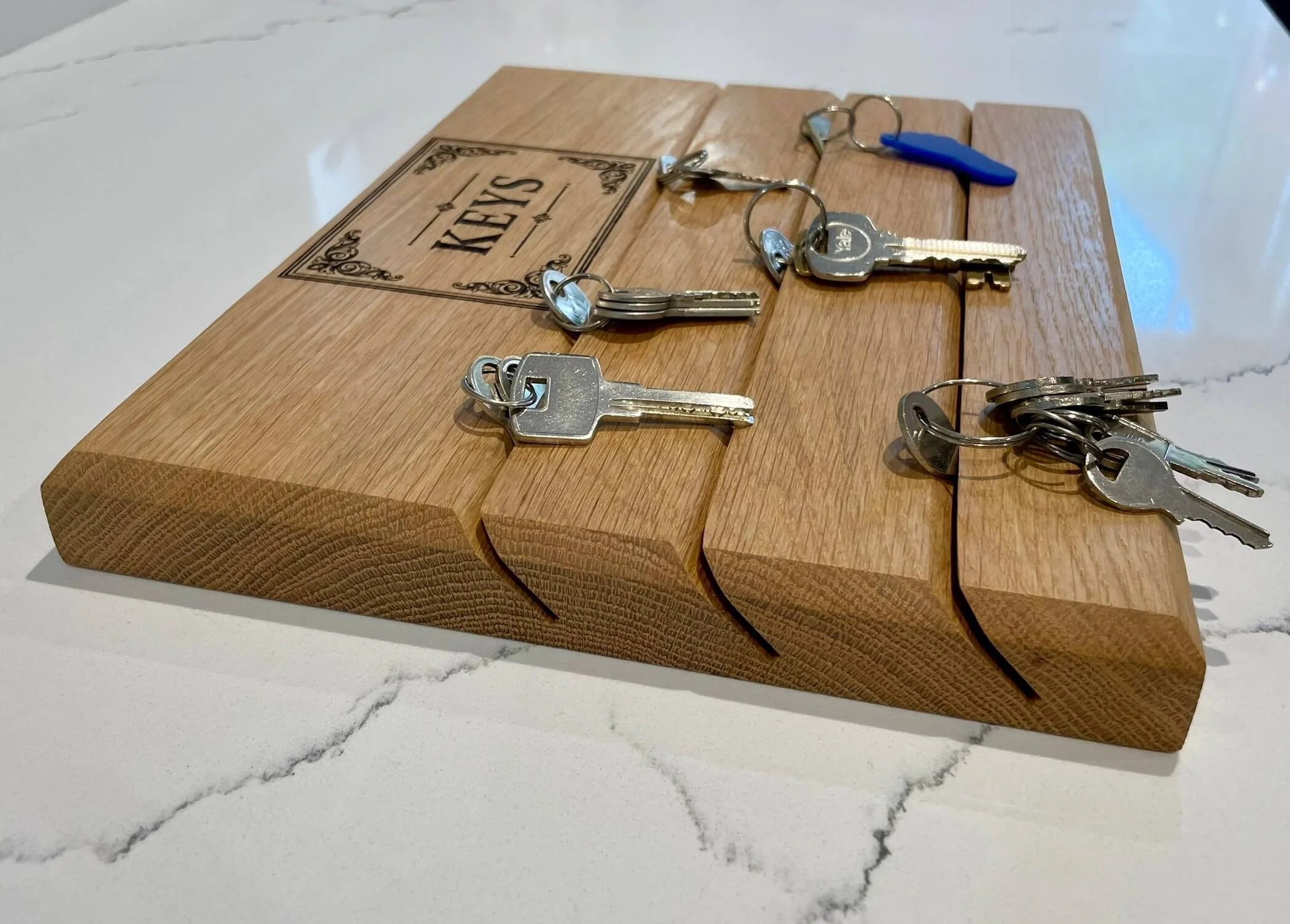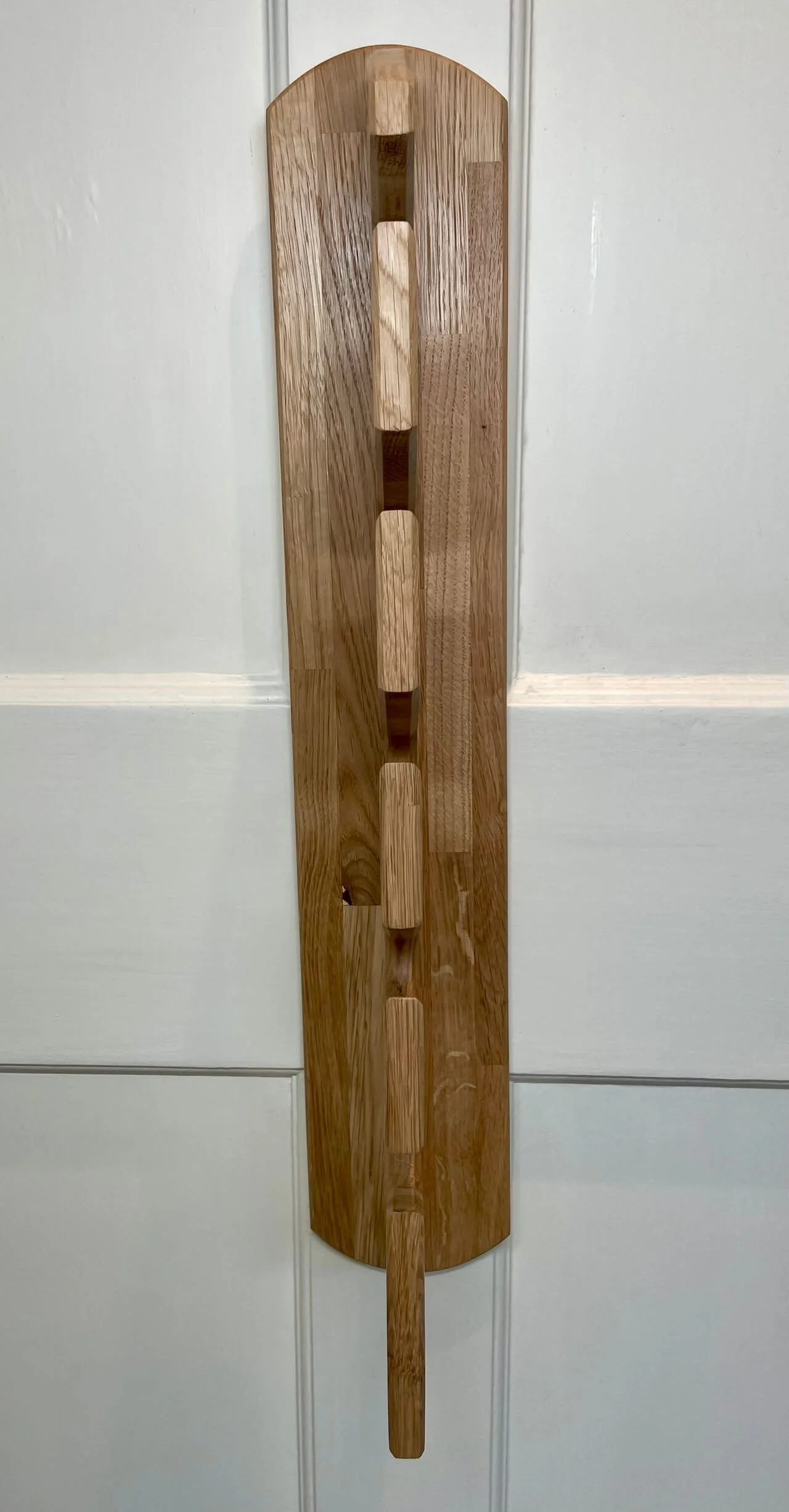 • This Key Hub is made from solid white oak and has angled slots where keys slide in and stay by gravity. It’s finished with a durable hard wax oil. To install, simply attach two mounts to the wall (supplied), then click the Key Hub onto them securely.